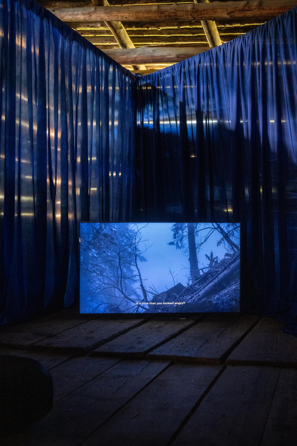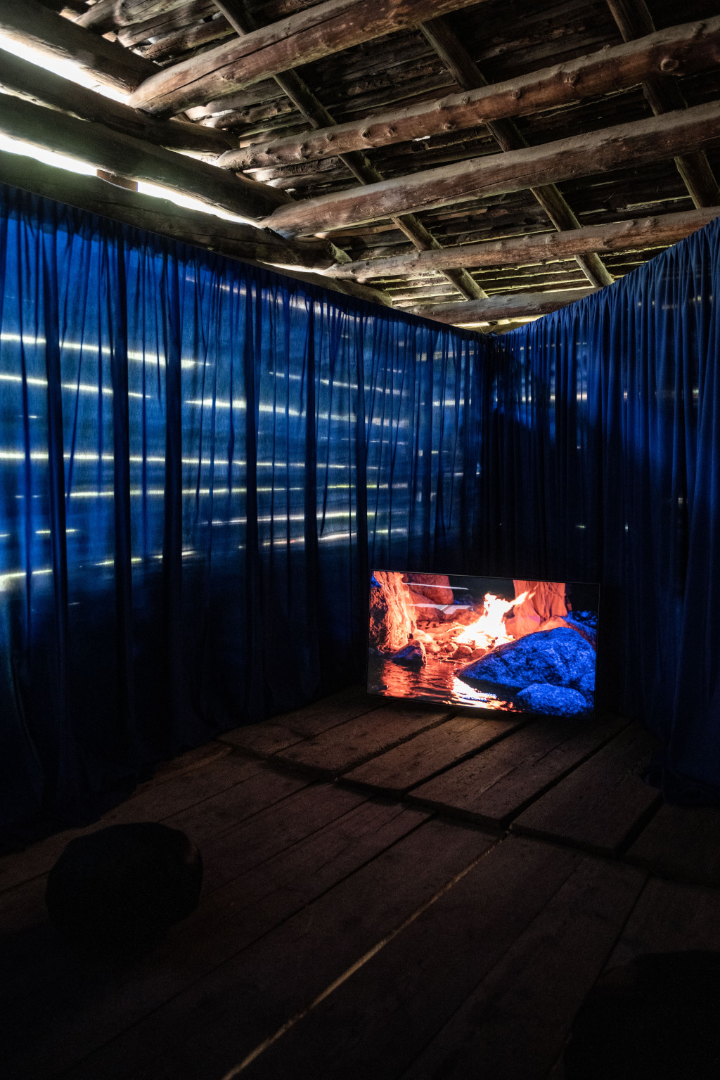 Lena Maria Thüring, Down the river, 2022, installazione video, 4K, 16:9, colore/audio (bargaiot con sottotitoli in inglese), stoffa, vari formati, 10’