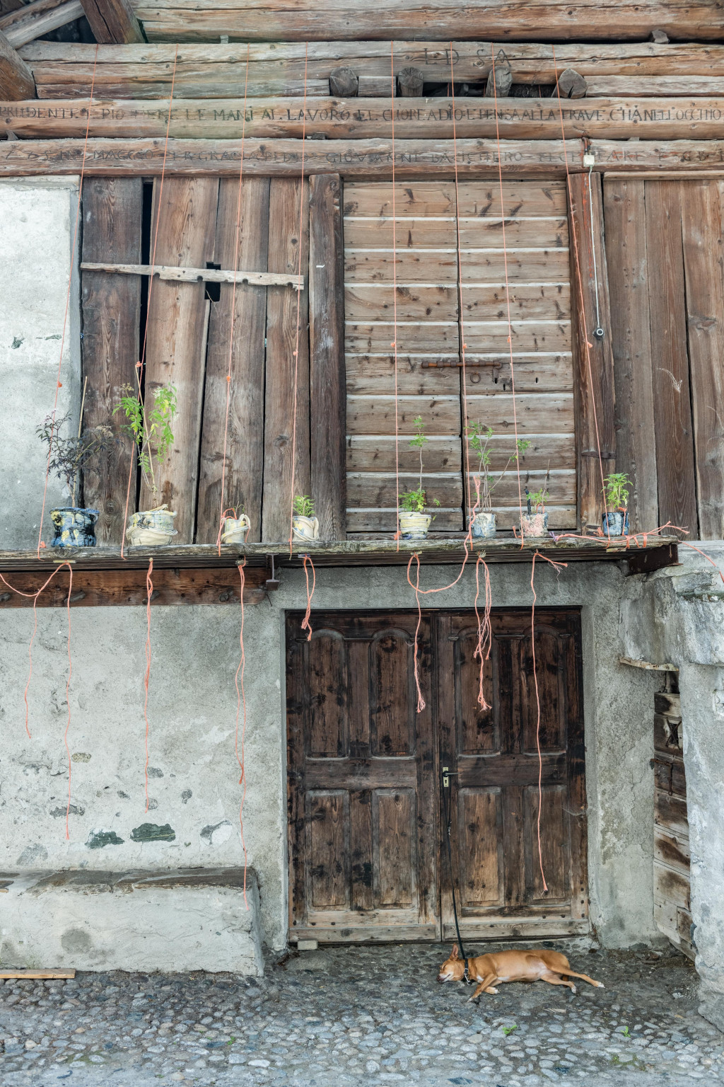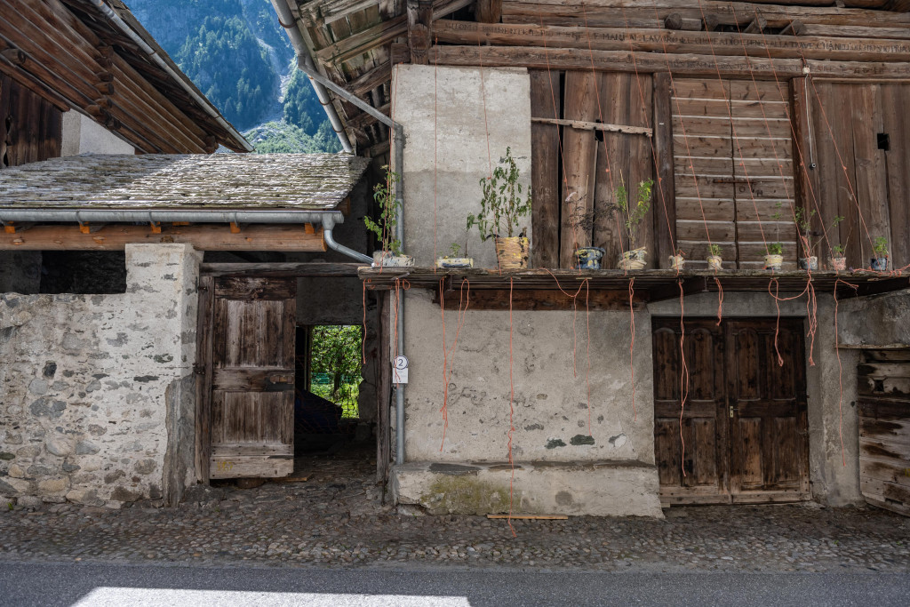 Die beiden Ställe an der Via Principale befinden sich in Privatbesitz und werden seit Langem nicht mehr für die Tierhaltung gebraucht. Im Untergeschoss des grösseren Stalles werden Maschinen aufbewahrt, das Obergeschoss wird zum Trocknen von Holztäfern benutzt. Die Gebäude hinter den Ställen sind ständig bewohnt. Den Bewohner:innen gehören der Gemüsegarten, auf den man durch den kleineren Stall blickt, und auch die Hühner, die diesen ab und zu besuchen.